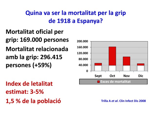 Per fer-nos una idea de com de cruenta va ser la pandèmia de Grip Espanyola, Trilla compara dades. S’estima que en els 4 anys 3 mesos i 14 dies que va durar Primera Guerra Mundial hi van morir més de 20 milions de persones (algunes fonts eleven aquesta xifra al voltant de 30 M). Doncs bé, en els 18 mesos que va durar la pandèmia van morir més de 50 milions de persones. La Grip Espanyola va posar fi a la vida de pràcticament el mateix nombre de persones que la I Guerra Mundial. En aquesta ocasió “els virus van ser més agressius que les persones, malauradament”, lamenta l’epidemiòleg.