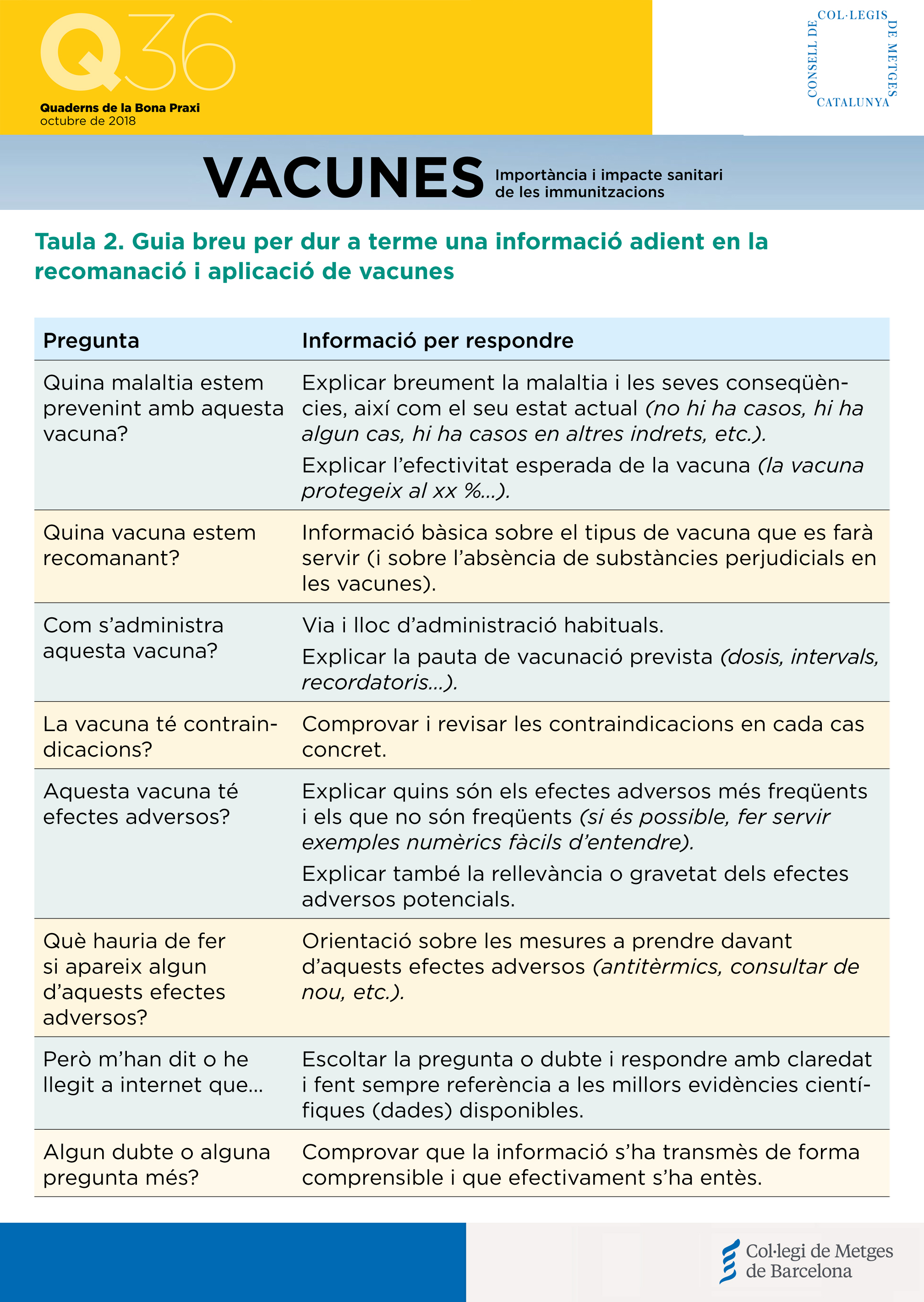 Els professionals de la salut som la principal font d’informació sobre vacunes, fins i tot entre les persones que decideixen no vacunar-se o no vacunar els seus fills. Els pacients acudeixen a la consulta per resoldre preguntes i dubtes i la intervenció del metge o la infermera té un efecte molt positiu en el procés de decisió en relació amb la vacunació. Així doncs, els professionals tenim el deure ètic de proporcionar la millor i més completa informació possible, explicant sempre els beneficis esperats i les possibles reaccions adverses, la seva freqüència i la seva gravetat.