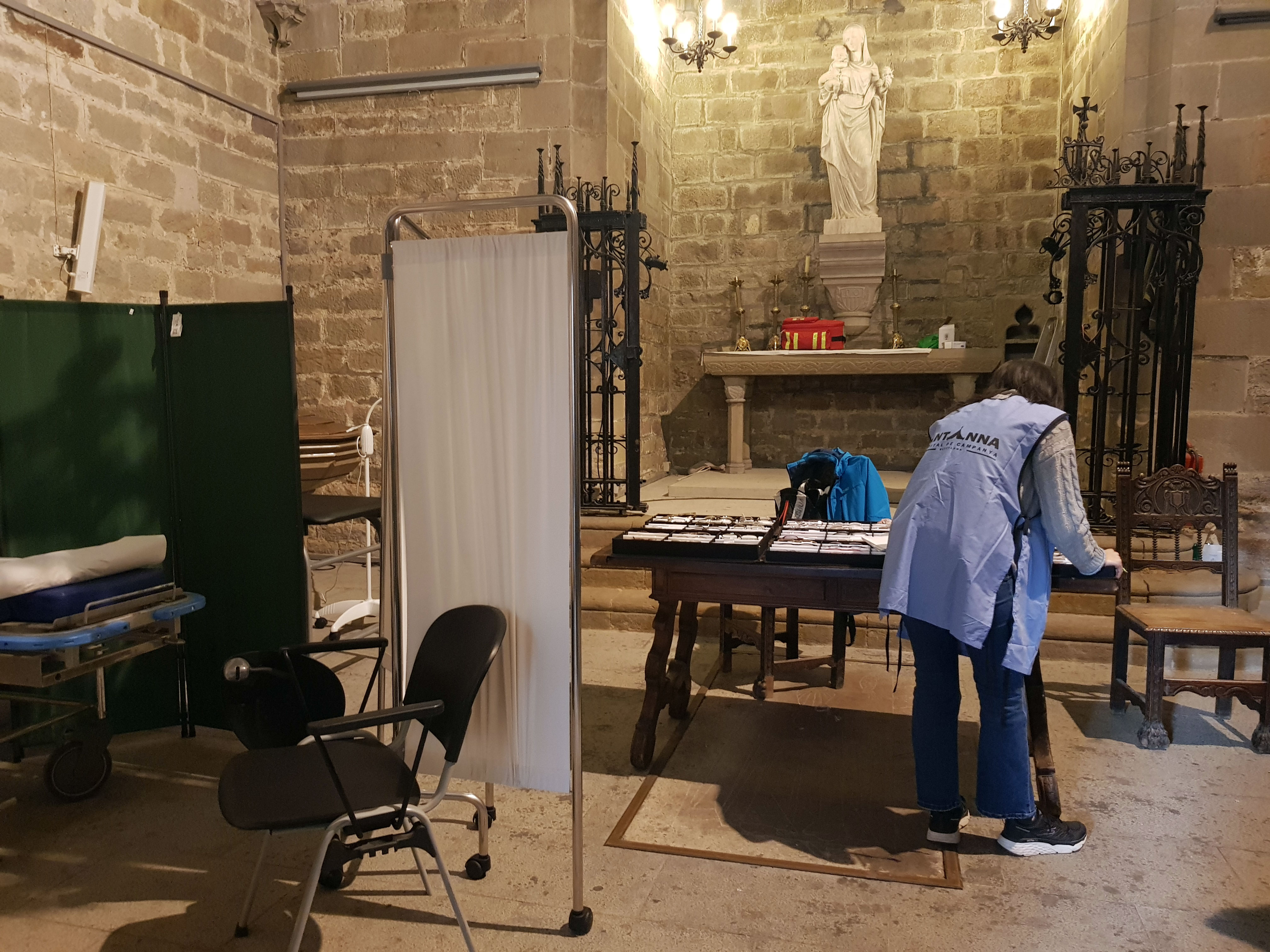 A l’església de Santa Anna hem anat envaint la capella del Santíssim. Abans es feia servir com a tal quan calia, però ara és específicament nostra. Hi tenim un sofà articulat per als serveis de podologia i de dentista, un aparell molt gran per graduar la vista, dos llits amb paravents per visitar i un carret amb medicació. I des de fa poc tenim la unitat mòbil que ens dona molta llibertat d’acció.