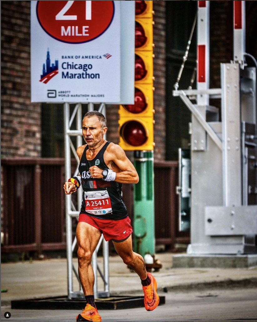 D’entre les majors, ens quedava pendent Boston i vam anar cap allà, però no hi vaig aconseguir millorar la marca, ni tampoc a Londres, uns mesos després. Però, amb aquells resultats em vaig classificar per a la final mundial de corredors de marató de més de 50 anys, que es feia el 2023 a Chicago. Això em va servir de motivació: pensar que potser no faria la meva millor marca, però que podria lluitar contra els vells de més de 50 anys. Com a preparació d’aquesta cursa, vaig tornar a fer la marató de Barcelona i vaig superar la meva marca: vaig fer 2 hores i 36 minuts. Vaig continuar entrenant-me. Chicago és una ciutat molt plana i molt bona per fer marques, tot i que habitualment fa molt vent i mal temps. Però aquell matí, va fer molt bon dia i vaig córrer no tant per batre la marca, sinó contra els meus rivals directes: vaig perseguir un grup de corredors de 50 a 54 anys. Vaig acabar la cursa competint mà a mà amb un corredor de Kazakhstan i el vaig guanyar. A la classificació final, a part d’un temps meravellós de 2 hores i 34 minuts, vaig quedar classificat en sisena posició de la final mundial d’homes de més de 50 anys i també vaig ser el primer català en arribar a la meta. Això et puja l’ego, perquè tinc 52 anys i em dedico a coses molt diferents de córrer maratons. A part de tenir unes bones condicions físiques per a aquest esport, hi ha influït el fet d’haver començat a córrer bastant tard i de no haver tingut lesions ni haver-me excedit de jove fent esport competitiu. També, per suposat, faig les meves proves d’esforç quan toca, segueixo un pla d’entrenament ben fixat i intento fer una dieta correcta.